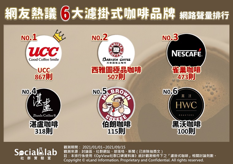 ▲網友熱議6大濾掛式咖啡品牌網路聲量排行。(圖/Social Lab社群實驗室提供)