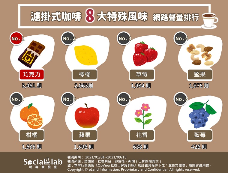 ▲濾掛式咖啡8大特殊風味網路聲量排行。(圖/Social Lab社群實驗室提供)