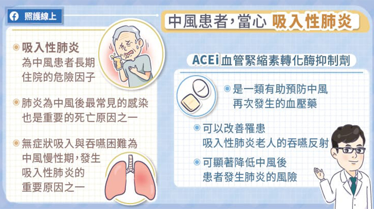 因此,為了降低中風併發肺炎感染的風險,建議中風患者可以使用ACEi(血管緊縮素轉化酶抑制劑)這類藥物來控制血壓,林柏霖解釋,日本有研究證實ACEi有助於降低吸入性肺炎的發生率,能夠改善中風患者的問題。