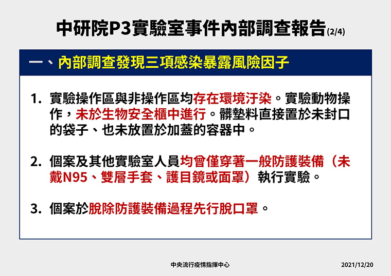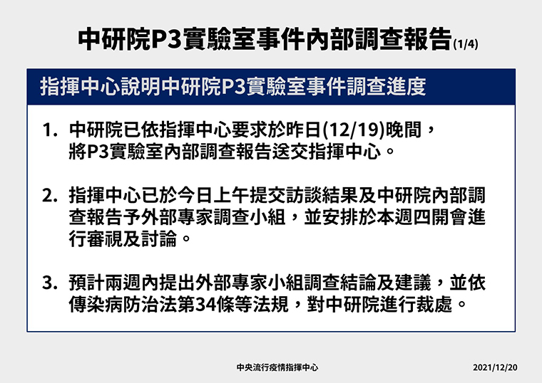 【NOW健康 葉立斌/台北報導】在12月初驚傳1例新冠肺炎本土個案,中研院P3實驗室傳出1名前研究助理確診意外,因周邊人員(包含當事人的同居人)全為陰性,待過了2個潛伏期後就能稍微放心。不過有關中研院P3實驗室感染案後續,中研院在昨(19)日晚間將調查報告回傳中央流行疫情指揮中心。