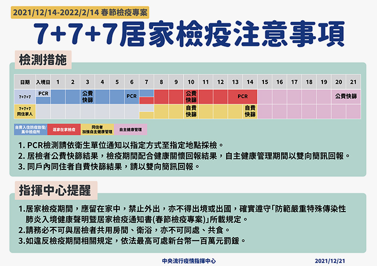 ▲適逢春節專案的第7天,指揮中心重申7+7+7居家檢疫期間注意事項。(圖/中央流行疫情指揮中心提供)