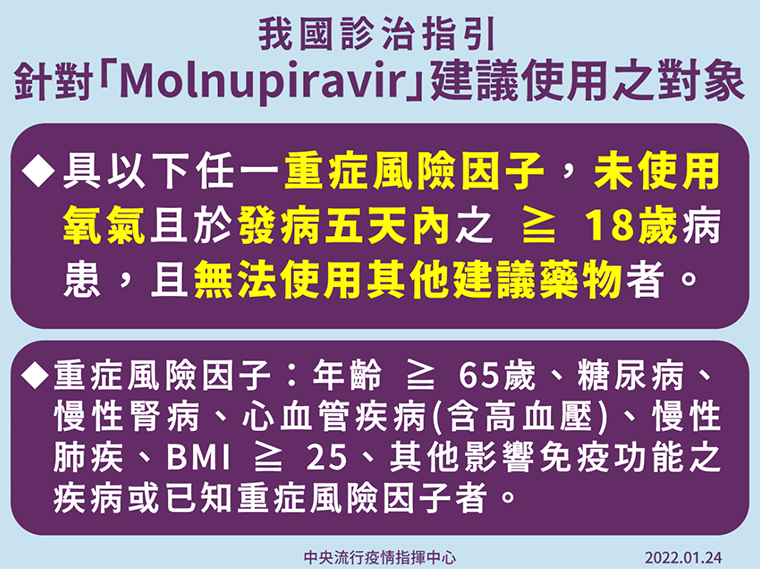而適合使用的患者上,今(24)日下午指揮中心例行記者會專家小組召集人張上淳說明,針對默沙東COVID-19口服藥「Molnupiravir」建議使用之對象,具以下任一重症風險因子,未使用氧氣且於發病5天内之18歲以上(含)病患,且無法使用其他建議藥物者。重症風險因子如下: