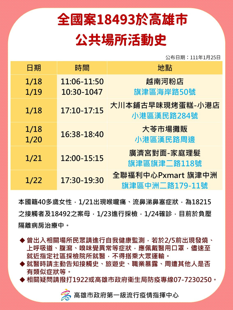 高雄市的確診者足跡則有多家小吃攤、藥妝店等。不僅是與這些足跡有重疊,只要您曾出入過港區一帶,或是曾到那裏工作,便需要出面採檢。