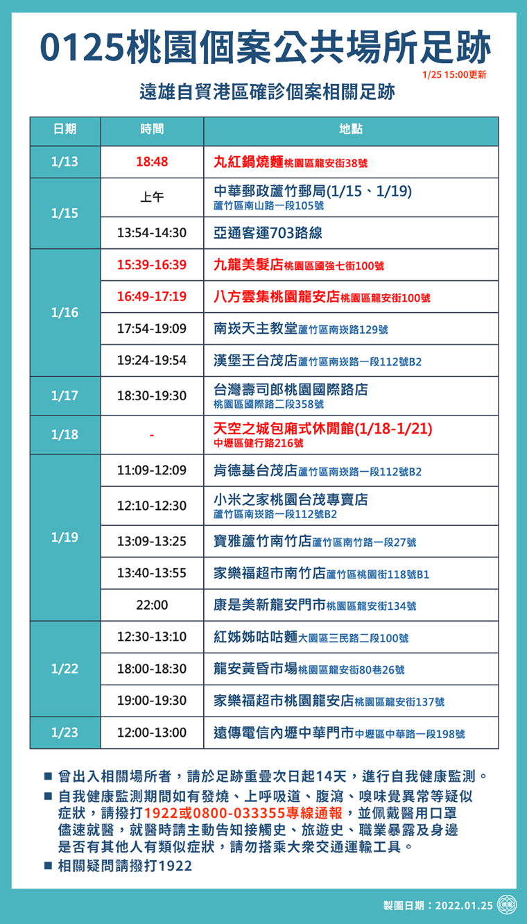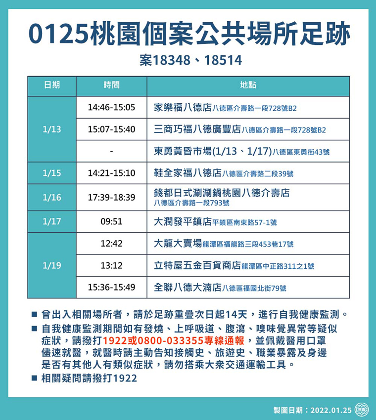 桃園市府在下午公布更新足跡,加入案18348、18514兩案,同時也公布遠雄自貿港區確診個案相關足跡。
