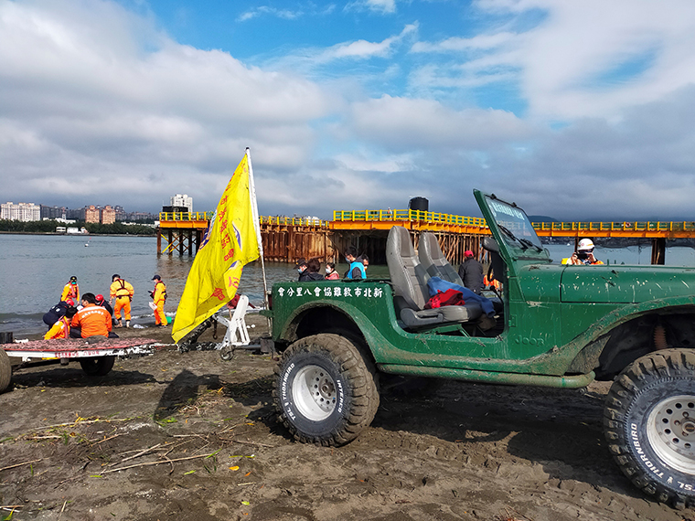 ▲新北救難協會八里分隊出動沙灘車協助鯨豚搬運。(圖/新北市動保處提供)