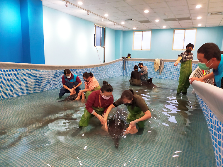 ▲3隻鯨豚平安抵達八斗子岸置中心,救援團隊安撫鯨豚緊張的情緒。(圖/新北市動保處提供)