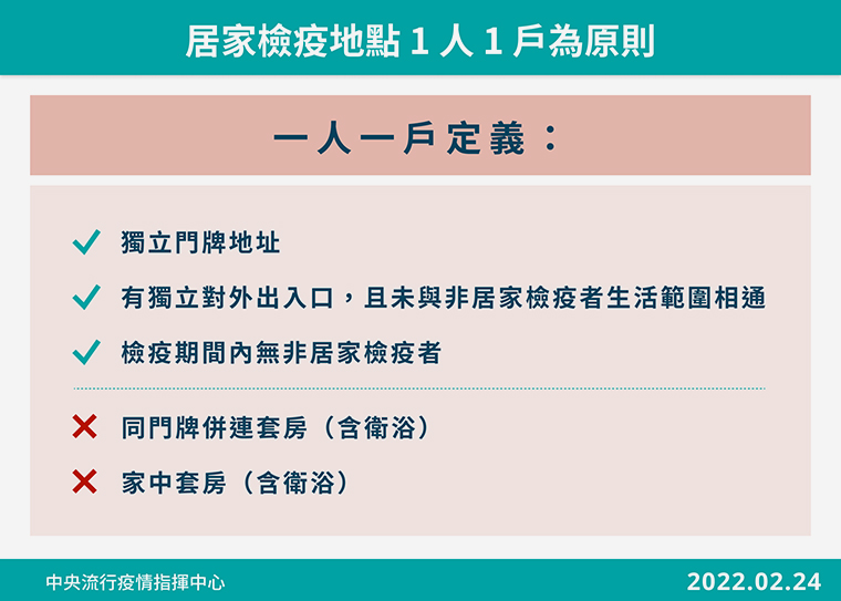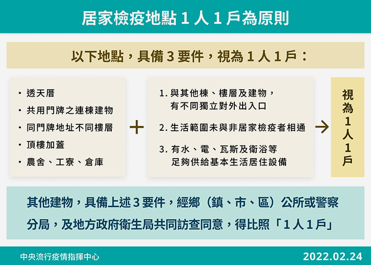 另外,指揮中心副指揮官陳宗彥詳細說明「1人1戶」的條件,「1人1戶」認定原則為:有獨立門牌,有獨立衛浴,有獨立出入口;如果是住處中或是同門牌併連的套房,則不屬於1人1戶。
