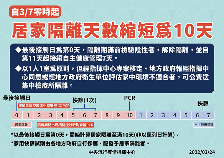 ▲3月7日起居家檢疫天數縮短為10天。(圖/中央流行疫情指揮中心提供)