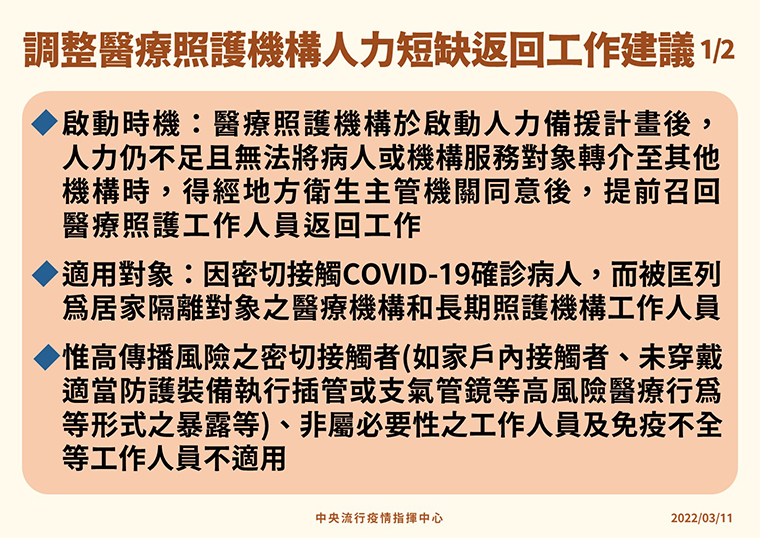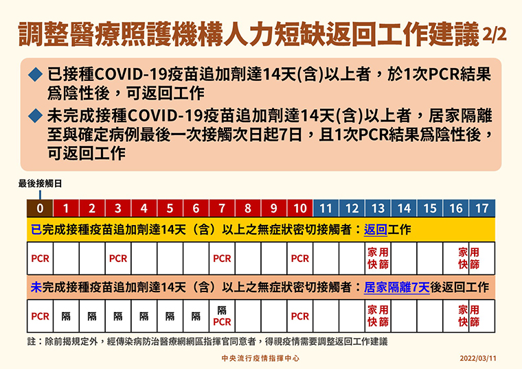 指揮中心表示,如醫護人員完成接種COVID-19疫苗追加劑達14天以上,且屬於無症狀密切接觸者,只要於1次核酸檢驗結果為陰性後,可返回工作,並於與確定病例最後一次接觸次日起第3、7、10日各再進行一次核酸檢驗,其後比照居家隔離者於自主健康管理期間之相關採檢規定。