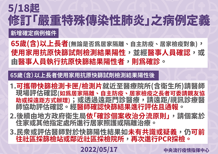 針對新修訂「嚴重特殊傳染性肺炎」病例定義,指揮中心說明,65歲(含)以上長者,無論是否為居家隔離、居家檢疫或自主防疫對象,如使用家用抗原快篩試劑檢測結果為陽性,可攜帶快篩檢測卡匣/檢測片就近至醫療院所(含衛生所)請醫師現場評估確認,達成醫病共識後,由醫師或醫事機構進行健保IC卡上傳通報或至法定傳染病通報系統進行通報,由系統自動研判確診。若本身屬於居家隔離、居家檢疫、自主防疫的長者,則可委託親友協助前往醫院,或採取遠距看診方式來進行醫師評估,並做後續通報動作。