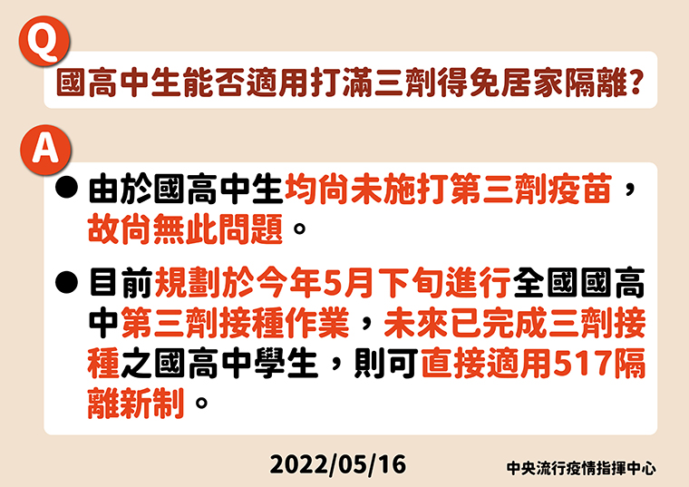 關於國內國高中生施打疫苗的計畫,陳時中透露,目前規劃於今年5月下旬進行全國國高中第3劑接種作業,未來已完成第3劑接種的國高中學生可直接適用完成3劑疫苗接種者免居家隔離的新制。