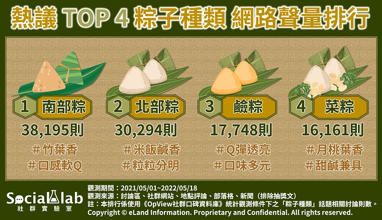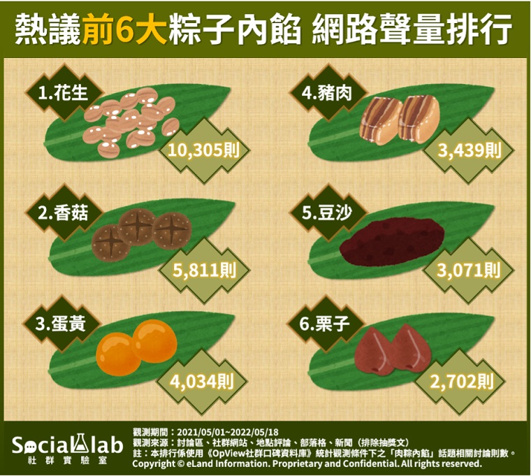【NOW健康 陳郁茹/台北報導】農曆5月5日迎來端午節,除了戴香包、喝雄黃酒、立蛋等習俗外,餐桌上絕不可少的料理便是粽子了,但粽子口味五花八門,究竟要吃哪1種呢?網路上也議論紛紛,《Social Lab社群實驗室》本次透過《OpView社群口碑資料庫》追蹤近1年內「粽子」話題的網路聲量表現,帶您了解有關網友熱議的各式粽子與內餡種類。