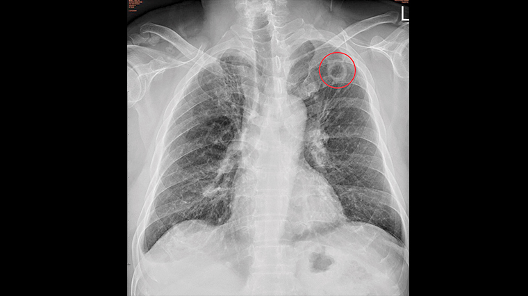 ▲烏日林新醫院胸腔內科醫師許人文指出,從患者X光檢查中發現左上肺有一個2.5公分的空洞。(圖/烏日林新醫院提供)