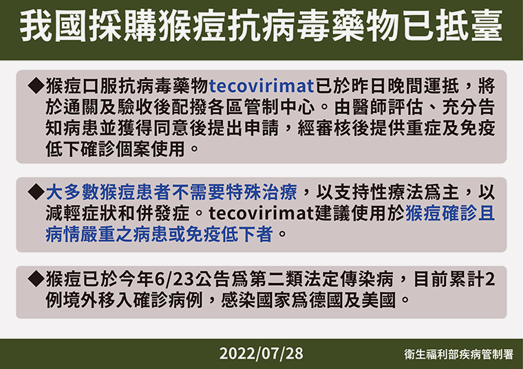 疾管署說明,tecovirimat經歐洲藥品管理局(EMA)核准使用於治療正痘病毒屬之天花、猴痘及牛痘;美國食品藥物管理局(FDA)核准使用於治療天花,美國疾病管制與預防中心(CDC)專案核可使用於治療因猴痘病毒感染惡化為重症或有重症危險因子之高風險患者,以降低死亡機率。我國衛生福利部食品藥物管理署已於今年7月13日同意依據藥事法第48條之2規定,核准其專案輸入。