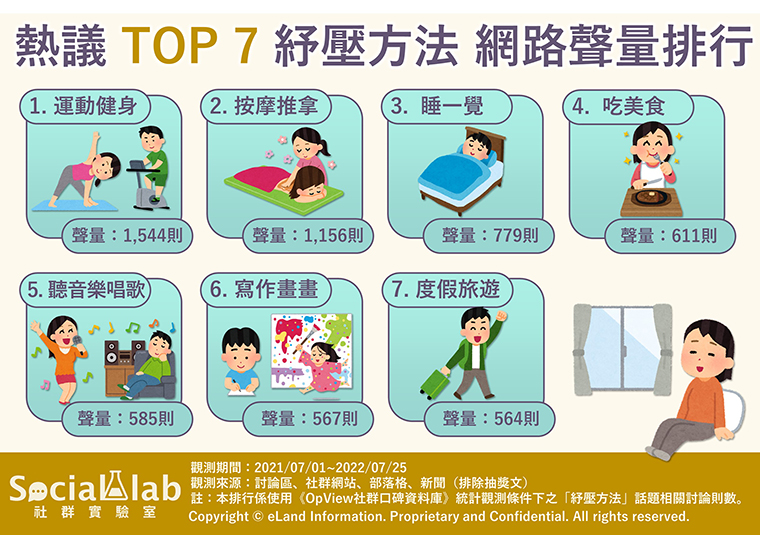 【NOW健康 游庭語/台北報導】無論是誰,生活中或多或少都會有些壓力,而面對這些壓力,每個人選擇的紓壓方法又各不相同,現在就來看看網友們都會做些什麼,來緩解肩上沈重的負擔,成功轉換心情吧!《Social Lab社群實驗室》本次透過《OpView社群口碑資料庫》追蹤近1年內「紓壓方法」話題的網路聲量表現,帶您了解網友熱議的前7大紓壓方法。