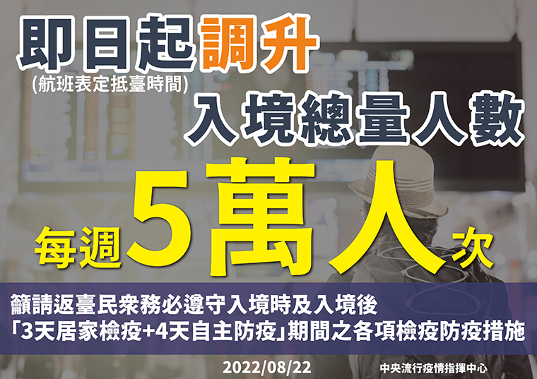 【NOW健康 葉立斌/台北報導】中央流行疫情指揮中心今(22)日表示,9月即將開學,境外生以及國人的返國入境需求增加,經綜合評估國內外疫情、邊境管制執行情形及國內防疫與醫療量能,自即日0時(航班表定抵台時間)起,調升入境總量人數為每週5萬人次為原則。