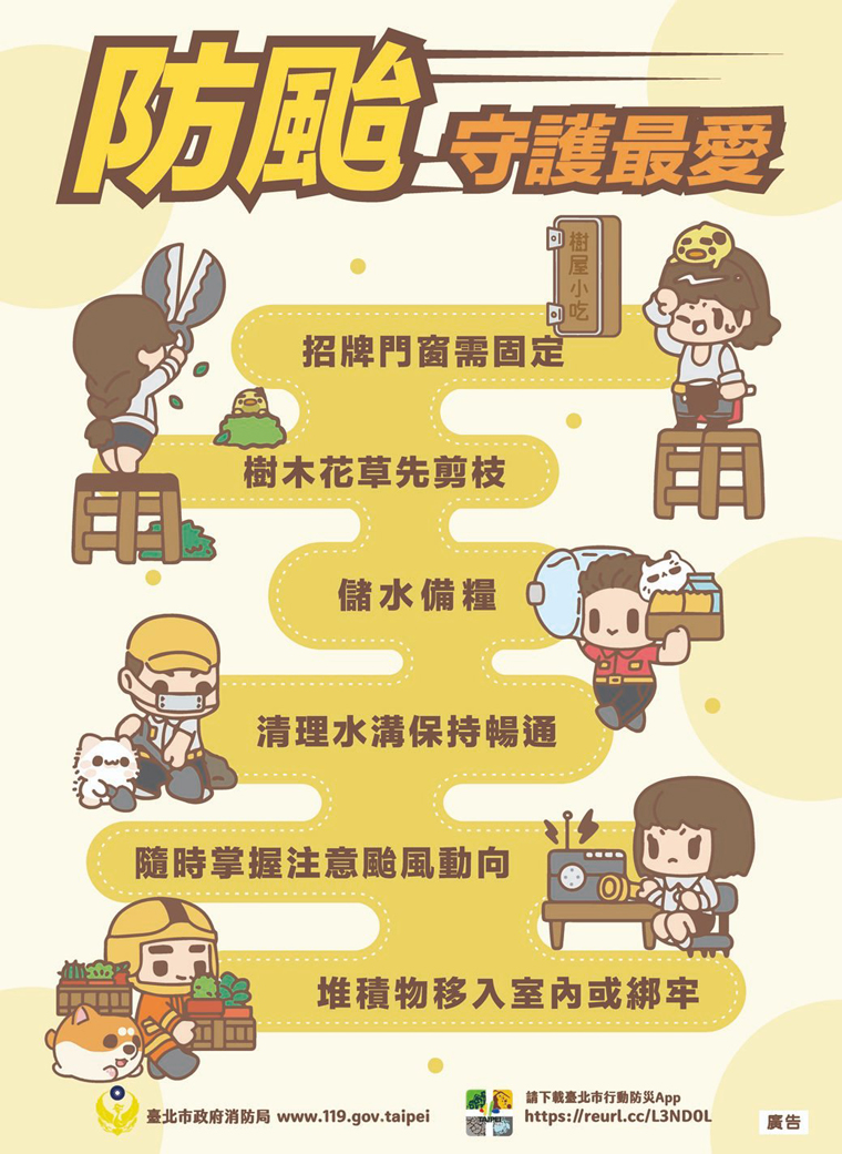 台北市消防局表示,颱風來襲前記得先準備飲水、食物、醫療用品以及其他防颱用品,放進緊急避難包中。同時應確認門窗緊閉,將盆栽等物品固定或收進室內。最後是務必記得清理排水溝。如果是商家,應將招牌固定,有種植樹木的話建議先剪除枝葉。