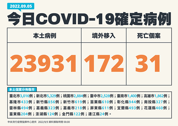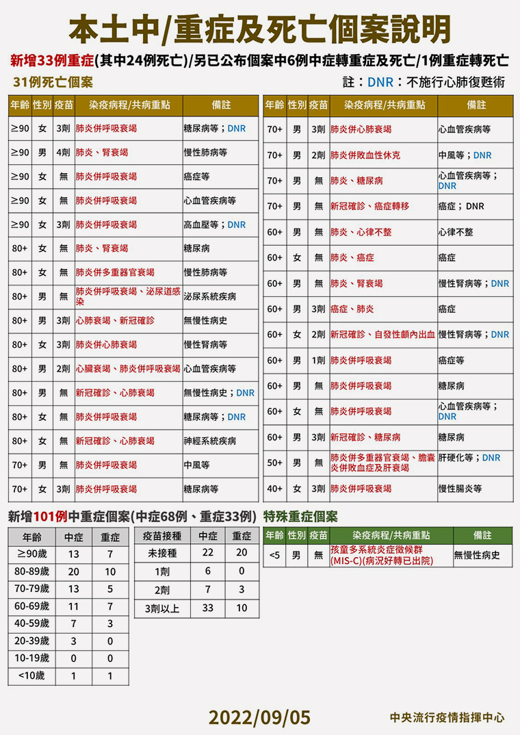 指揮中心指出,今日新增31例本土病例死亡個案,為17例男性、14例女性,年齡介於40多歲至90多歲以上,皆屬重度感染、29例具慢性病史、21例未接種3劑以上COVID-19疫苗。確診日介於今年5月21日至9月2日,死亡日期介於5月26日至9月2日。