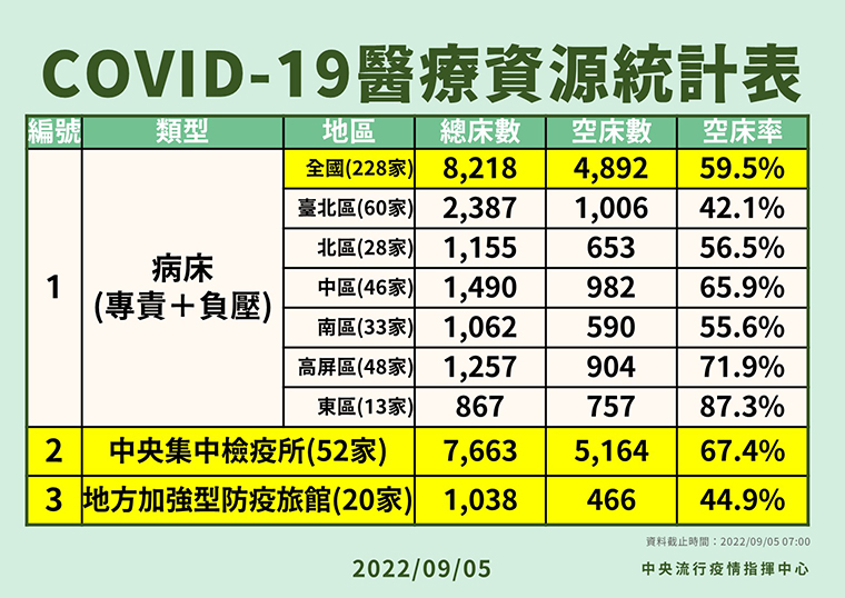 指揮中心進一步說明,台北區總床數為2,387床,空床數1,006床,空床率42.1%,北區總床數1,155床,空床數653床,空床率56.5%,中區總床數為1,490床,空床數982床,空床率65.9%,南區總床數為1,062床,空床數590床,空床率55.6%,高屏區總床數為1,257床,空床數904床,空床率71.9%,東區總床數為867床,空床數757床,空床率87.3%。