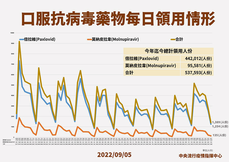 指揮中心公布口服抗病毒藥物領用狀況,Paxlovid已使用1,254人份,莫納皮拉韋已使用135人份,總共使用了1,389人份。今年Paxlovid累計用藥為442,012人份,莫納皮拉韋累計用藥為95,581人份,共累計537,593人份。