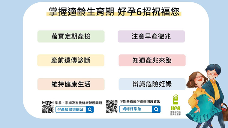 為降低高齡孕婦妊娠風險,國民健康署提供「好孕6招」,希望準爸媽能安心迎接新生命: