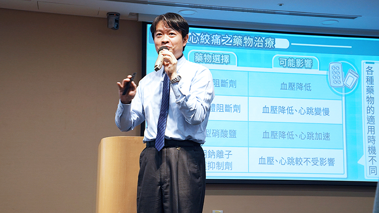 ▲林謂文醫師談到,治療心絞痛除了傳統藥物以外,還有新機轉抗心絞痛藥物可以做選擇,臨床證實新機轉藥物不論是單用或是併用治療皆可減少心絞痛發作頻率、提高生活品質且不影響心跳和血壓、改善胸痛、比較不會頭痛等副作用。(攝影/李家宇)