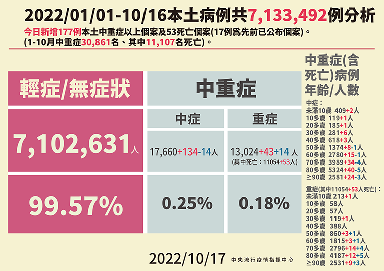 指揮中心表示,中症增加134人,重症增加43例,同時有53例死亡病例。今年共累計有7,133,492例本土病例,輕症占比99.57%,中症占比為0.25%,重症比為0.18%。