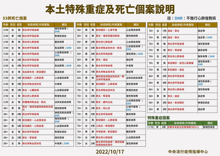 指揮中心指出,今日新增53例本土病例死亡個案,為26例男性、27例女性,年齡介於50多歲至90多歲以上,皆屬重度感染、48例具慢性病史、31例未接種3劑以上COVID-19疫苗。確診日介於今年6月9日至10月14日,死亡日期介於6月9日至10月14日。
