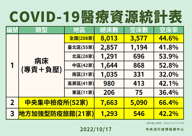 指揮中心進一步說明,台北區總床數為2,857床,空床數1,194床,空床率41.8%,北區總床數1,291床,空床數696床,空床率53.9%,中區總床數為1,644床,空床數868床,空床率52.8%,南區總床數為1,035床,空床數331床,空床率32.0%,高屏區總床數為980床,空床數413床,空床率42.1%,東區總床數為206床,空床數75床,空床率36.4%。