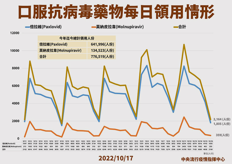指揮中心公布口服抗病毒藥物領用狀況,Paxlovid已使用1,805人份,莫納皮拉韋已使用359人份,總共使用了2,164人份。今年Paxlovid累計用藥為641,996人份,莫納皮拉韋累計用藥為134,523人份,共累計776,519人份。