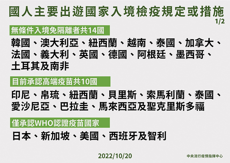 指揮中心表示,首先我國人民可無條件入境,並且免隔離之國家有:韓國、澳洲、紐西蘭、泰國、法國、義大利、英國、德國、阿根廷、南非。