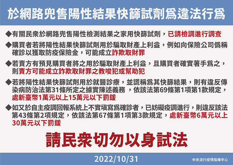 如果用這些快篩向醫師稱自己確診,則違反《傳染病防治法》第31條所定之據實陳述義務,依照《傳染病防治法》第69條第1項第1款規定,處1萬元以上15萬元以下罰款;如確診後在自主疫報系統上宣稱自己確診,同樣違反《傳染病防治法》第43條第2項規定,依該法第67條第1項第3款,可處6萬元以上30萬以下,請民眾切勿以身試法。