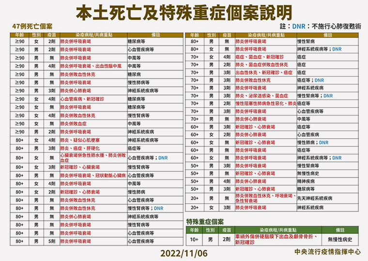 今新增47例本土病例死亡個案,為31例男性、16例女性,年齡介於20多歲至90多歲以上,皆屬重度感染、46例具慢性病史、27例未接種3劑以上疫苗。
