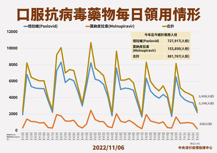 ▲口服抗病毒藥物每日領用情形。(圖/中央流行疫情指揮中心提供)