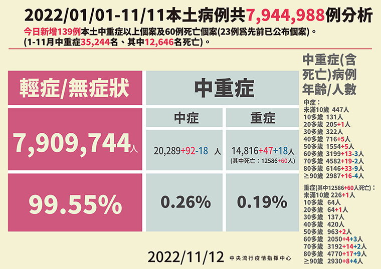 指揮中心表示,中症增加92人,重症增加47例,同時有60例死亡病例。今年共累計有7,944,988例本土病例,輕症占比99.55%,中症占比為0.26%,重症比為0.19%。