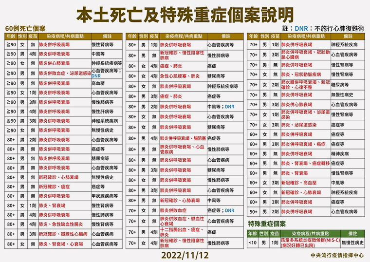 指揮中心指出,今日新增60例本土病例死亡個案,為38例男性、22例女性,年齡介於50多歲至90多歲以上,皆屬重度感染、57例具慢性病史、39例未接種3劑以上COVID-19疫苗。確診日介於今年9月30日至11月9日,死亡日期介於10月15日至11月9日。