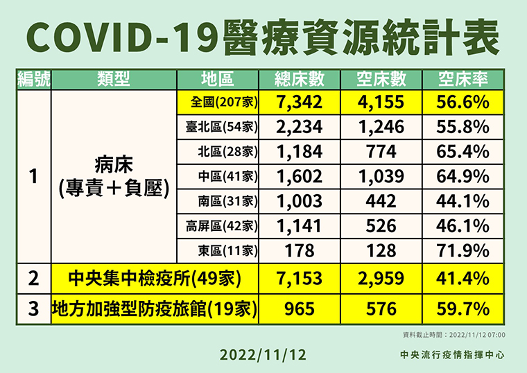 指揮中心進一步說明,台北區總床數為2,234床,空床數1,246床,空床率55.8%,北區總床數1,184床,空床數774床,空床率65.4%,中區總床數為1,602床,空床數1,039床,空床率64.9%,南區總床數為1,003床,空床數442床,空床率44.1%,高屏區總床數為1,141床,空床數526床,空床率46.1%,東區總床數為178床,空床數128床,空床率71.9%。
