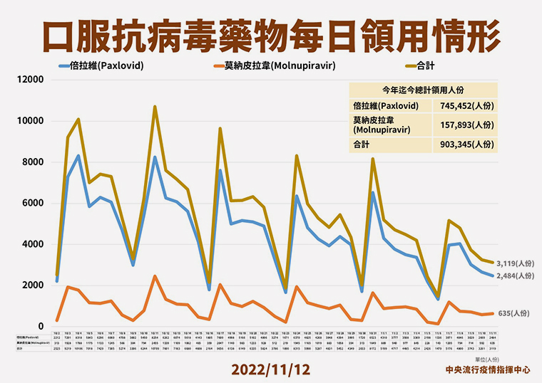 指揮中心公布口服抗病毒藥物領用狀況,Paxlovid已使用2,484人份,莫納皮拉韋已使用635人份,總共使用了3,119人份。今年Paxlovid累計用藥為745,452人份,莫納皮拉韋累計用藥為157,893人份,共累計903,345人份。