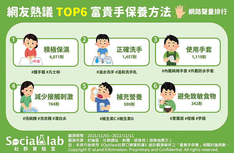▲網友熱議的6大保養、預防富貴手的方式。(圖/《OpView社群口碑資料庫》提供)