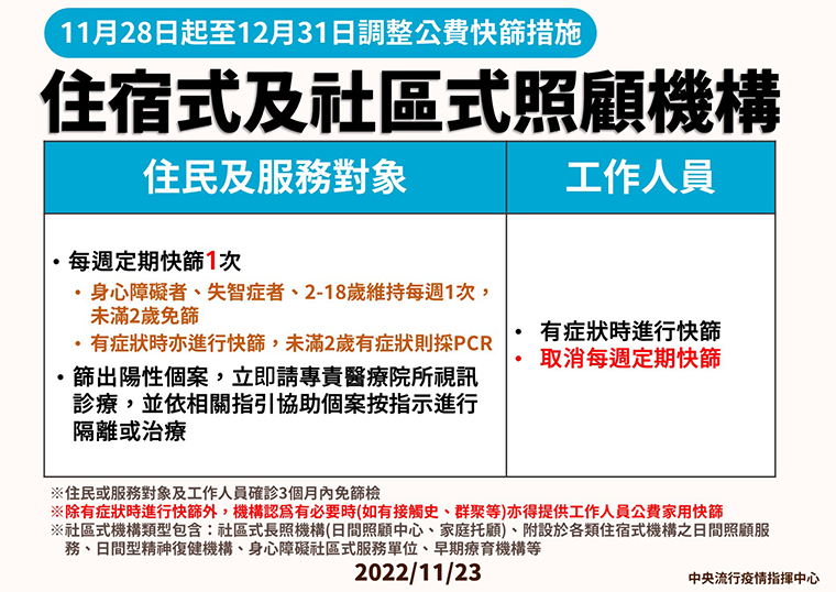 自11月28日起至12月31日篩檢頻率放寬為服務對象每週定期快篩1次(身心障礙者、失智症者、2至18歲維持每週1次,未滿2歲免篩),有症狀時亦進行快篩,未滿2歲有症狀則採PCR;工作人員取消每週定期快篩,若出現症狀時則須進行快篩,另機構認為有必要時(如有接觸史、群聚等)亦得提供工作人員公費家用快篩;住民或服務對象及工作人員如為確診康復者,3個月內免篩檢,後續將再視疫情狀況調整篩檢頻率。