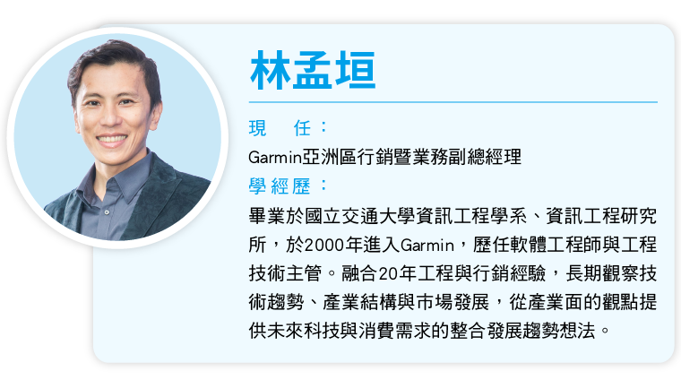 提到Garmin,許多人的第一印象,就是「導航」,然而近年來Garmin更以「穿戴裝置」深入人心。Garmin亞洲區行銷暨業務副總經理林孟垣坦言,Garmin從導航起家,一直到2013、14年隨著智慧穿戴的興起,加上企業對於員工健康的重視,鼓勵員工健走一萬步等企業內部健康競賽的推行,讓結合智慧型手機的穿戴裝置如Garmin運動手環等產品大受歡迎。之後更進一步發展成為系統性的整合服務,包含產品設計、行銷、用戶數據管理、企業應用等,今天的Garmin已經超越當初企業健康競賽的範疇。