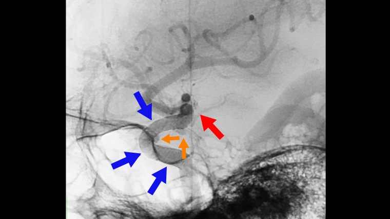 ▲醫師小心避開前脈絡叢動脈(紅箭頭標示處),以血流導向裝置(藍箭頭標示處),治療患者的2顆腦動脈瘤(橘箭頭標示)。(圖/衛生福利部台北醫院提供)