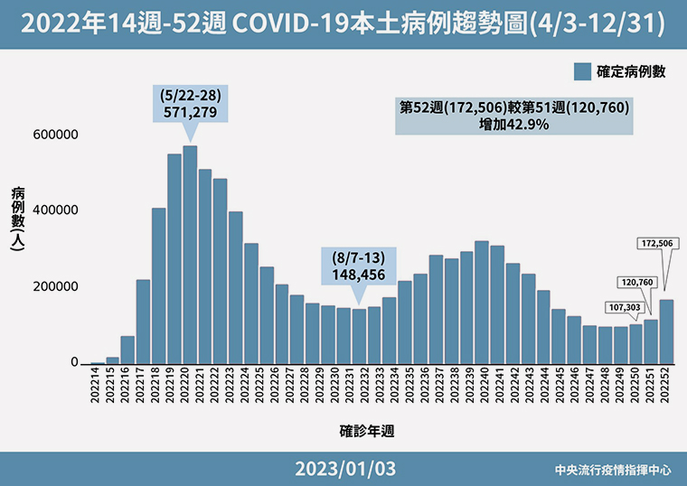 ▲從本土病例趨勢圖可看出,疫情比2022年最後1週明顯上升。(圖/中央流行疫情指揮中心提供)