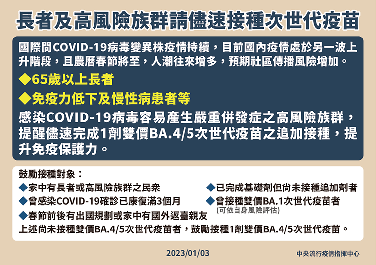 醫療應變組副組長羅一鈞表示,目前感染過Omicron以及接種過疫苗的人,仍有交叉保護力,隨著疫情升溫,羅一鈞再次呼籲民眾接種次世代疫苗。發言人莊人祥表示,因應變異株疫情,跨年、春節等活動相當多,社區傳染風險會逐漸升高,因此呼籲長者與高風險族群,應及早接種次世代疫苗。