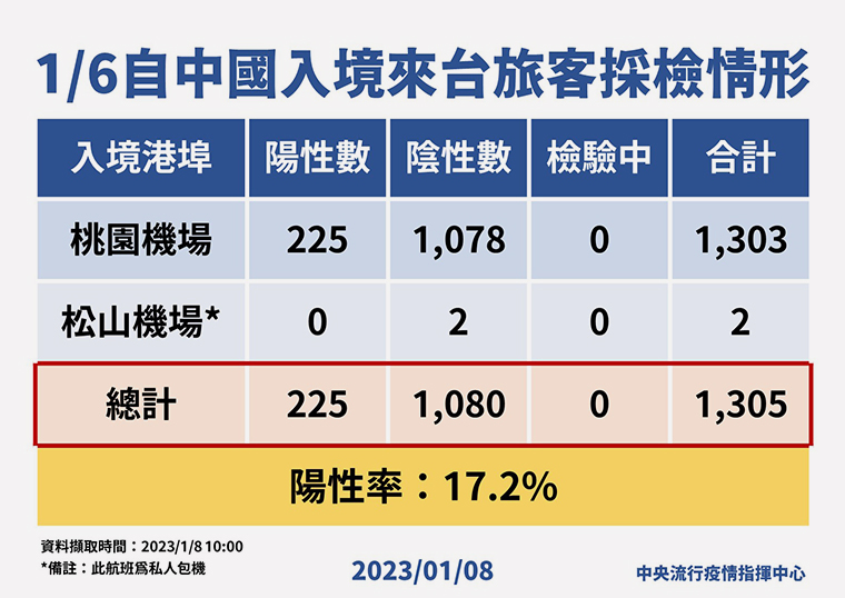 ▲1月6日自中國入境來台旅客採檢情形。(圖/中央流行疫情指揮中心提供)