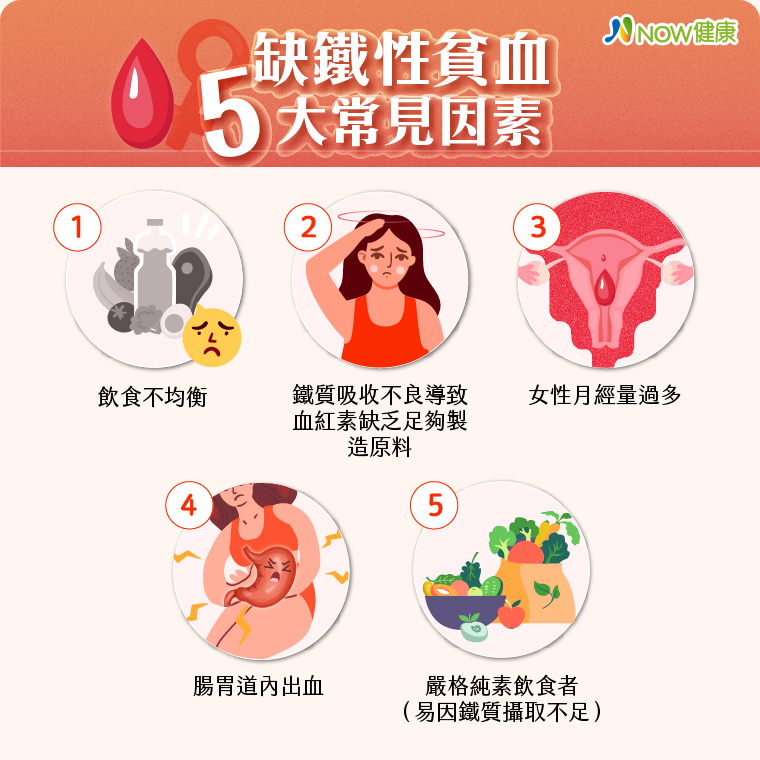 家醫科醫師黃農茵表示,「鐵」為組成血紅素的必須元素,而血紅素則是組成紅血球的重要物質,紅血球將氧氣運送至全身供細胞代謝,一旦血紅素不足,就會影響紅血球正常功能,導致組織器官缺氧。黃農茵列舉缺鐵性貧血5大常見原因: