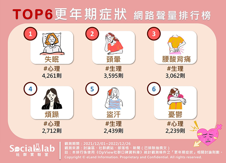 【NOW健康 游庭語/台北報導】更年期是女性必經的人生階段,由於女性荷爾蒙分泌逐漸減少,在這期間身體會隨之產生劇烈變化,各種不適的症狀,不只對身體產生影響,也容易造成情緒低落,你或你的家人是否也正在面對相同的困擾呢?《Social Lab社群實驗室》本次透過《OpView社群口碑資料庫》追蹤近1年內「更年期症狀」話題的網路聲量表現,帶您了解有關網友熱議的6大更年期症狀有哪些。
