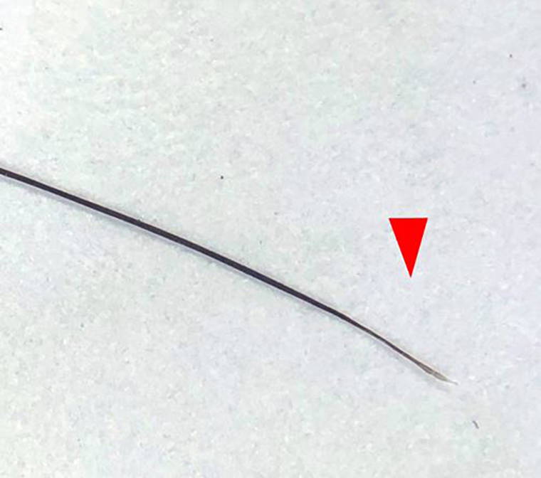 ▲台大新竹分院皮膚部醫師謝博丞說明,受到圓禿影響的髮根會有變細的情形(如箭頭所示)。(圖/新竹台大分院提供)