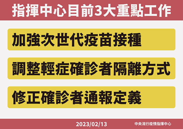 ▲指揮中心3大重點工作為:加強次世代疫苗接種、調整輕症確診者隔離方式、修正確診通報定義。(圖/中央流行疫情指揮中心提供)