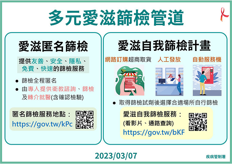 詳細的自我篩檢試劑簡介及相關服務內容、試劑取得方式與地點、愛滋指定醫事機構名單等資訊可至自我篩檢專頁查詢,或撥打免付費防疫專線1922,或0800-001922洽詢。